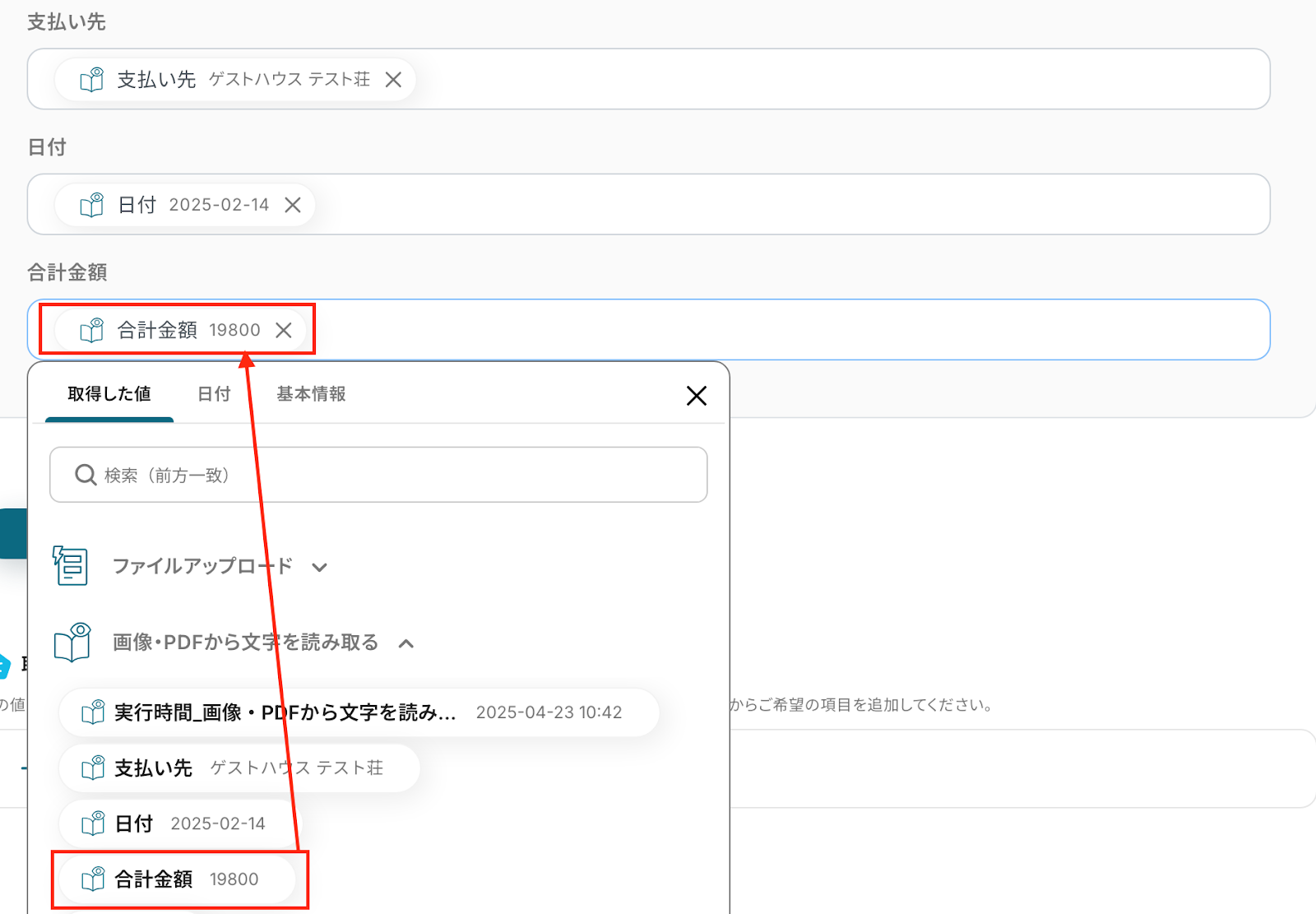 下図のように、入力欄をクリックして表示される「取得した値」から、各項目に適切な値を設定しましょう。