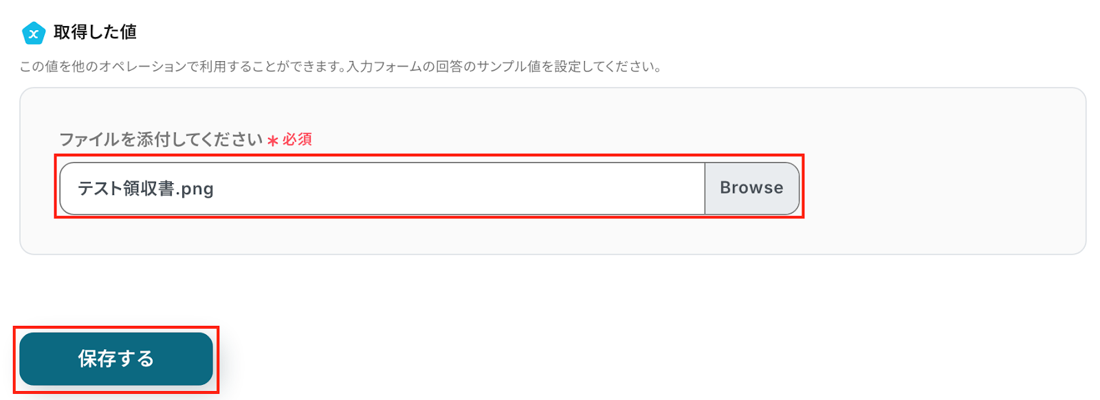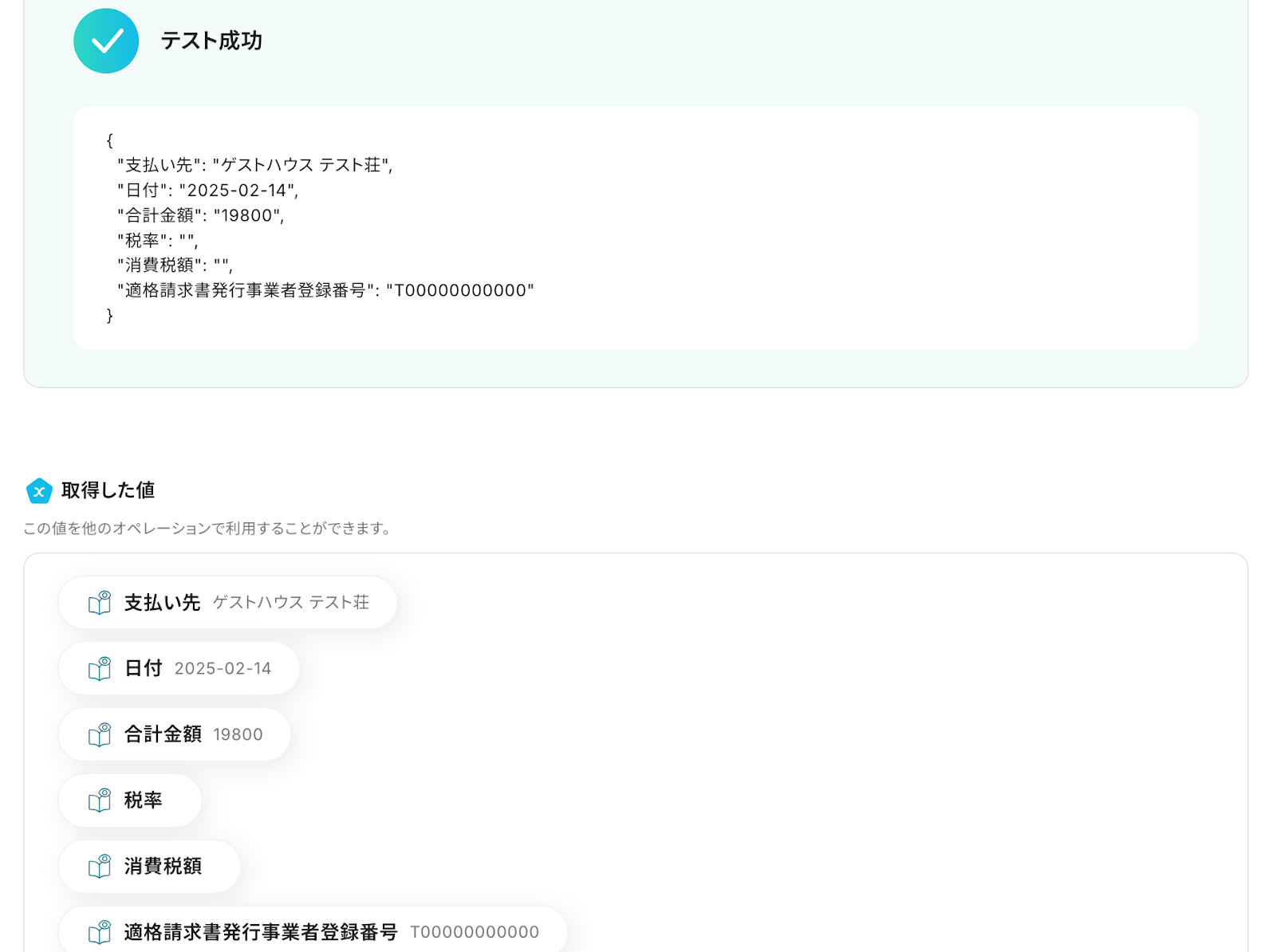 テストが成功すると、OCRで読み取った情報が「取得した値」に表示されます。問題がなければ、「保存する」をクリックしましょう。