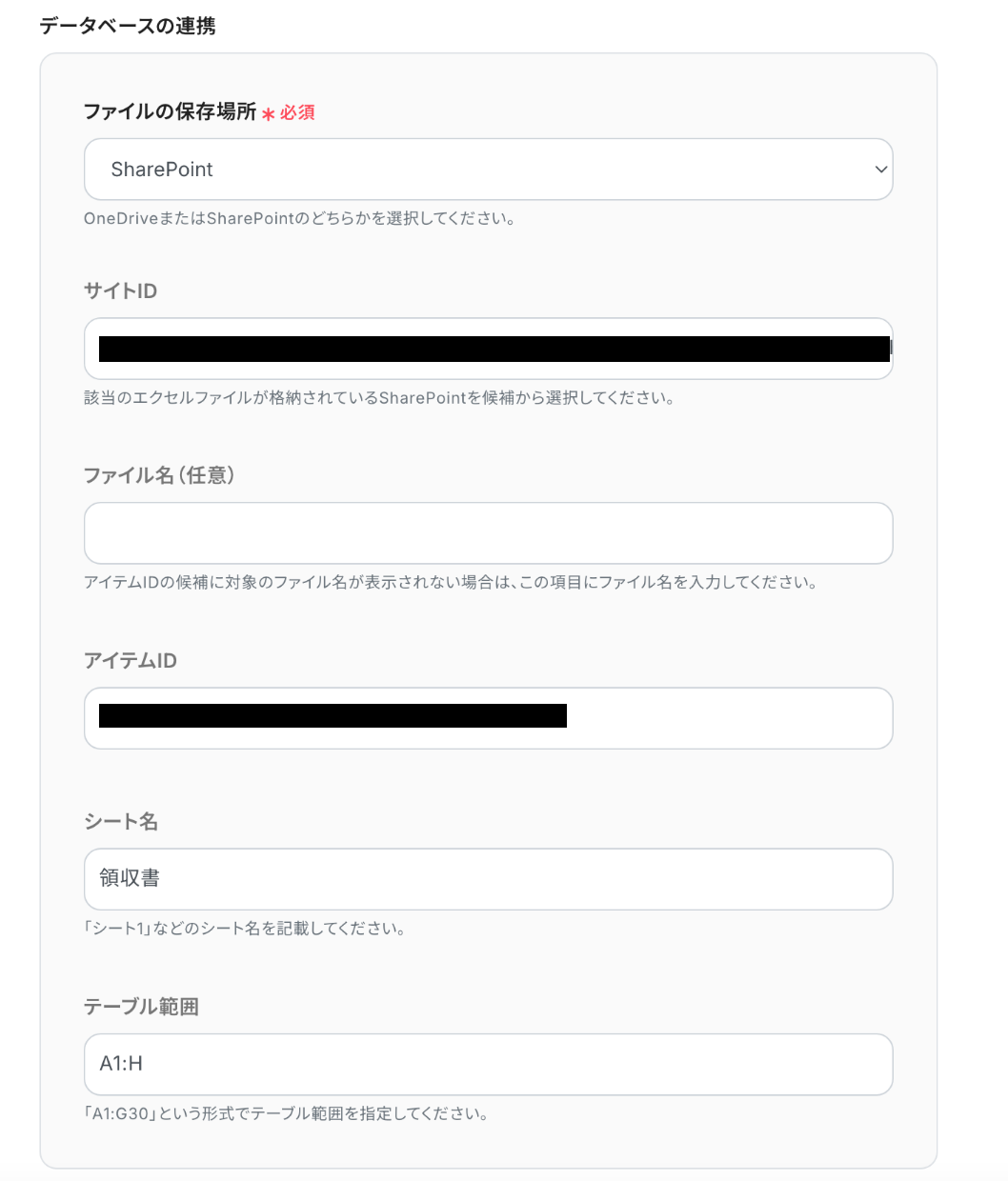 - テーブル範囲:データを追加するテーブル範囲を任意で入力