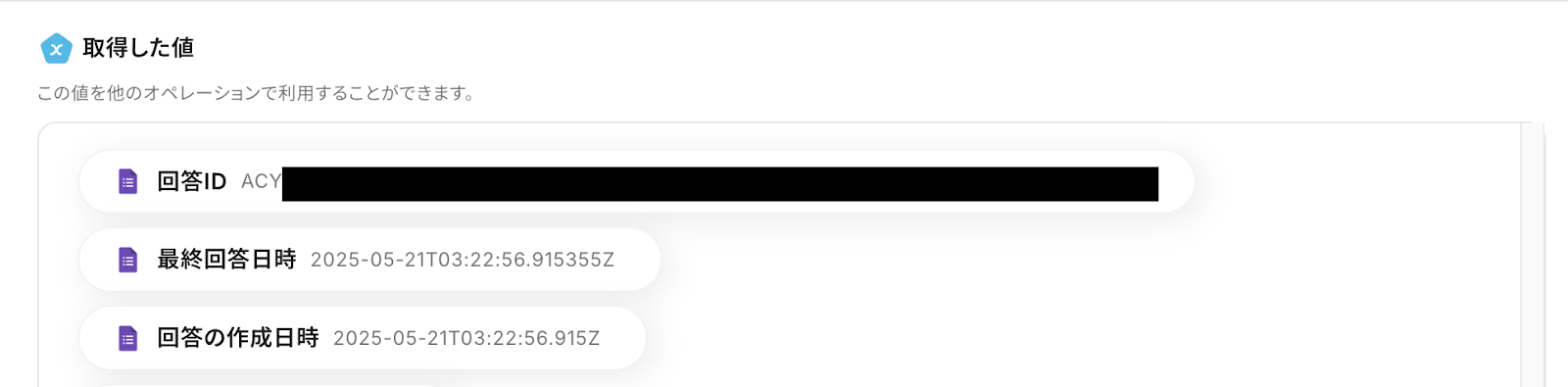 ・Googleフォームをトリガーとして使用した際の回答内容を取得する方法は下記を参照ください。