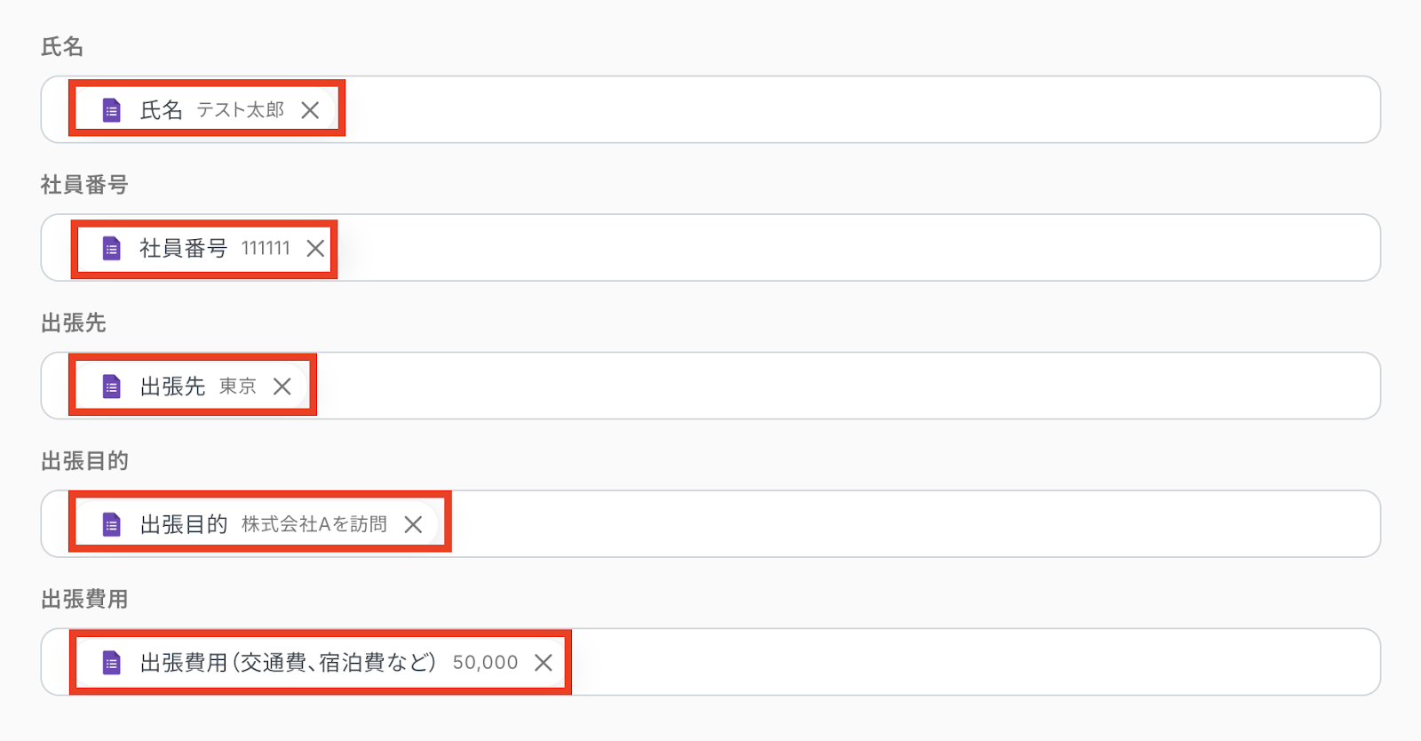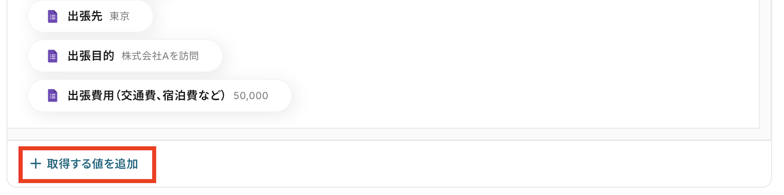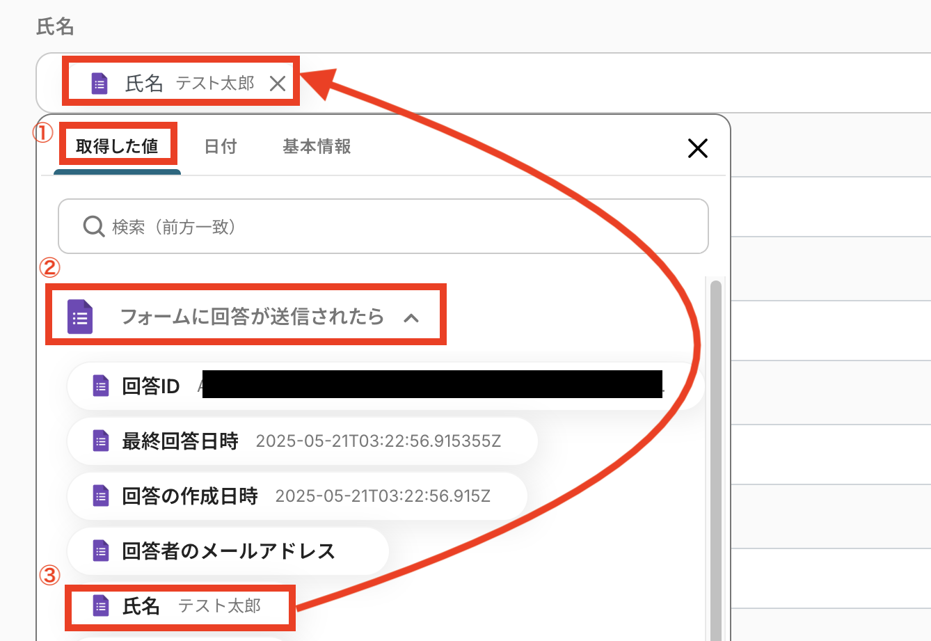 もし、取得した値の中を確認してフォームに回答した内容(氏名・社員番号など)が取得した値として表示されていない場合は、フォームへの回答項目を取得する必要があります。