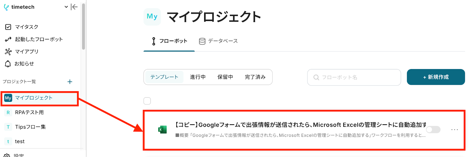 左側にあるメニューの「マイプロジェクト」から、コピーしたテンプレートを開きます。