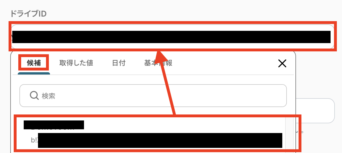 「ドライブID」と「アイテムID」と「シートID」は候補から選択できます。