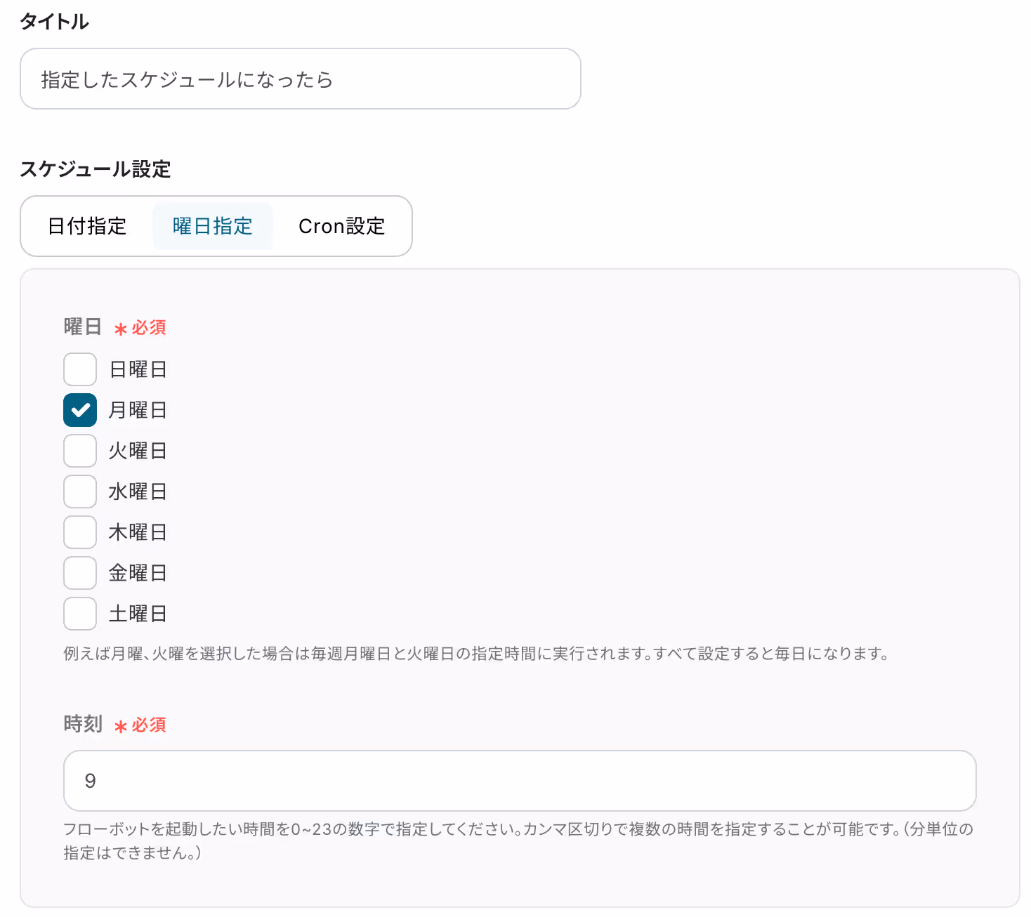 続いて、「スケジュール設定」でフローボットを起動したい日付や曜日を設定しましょう。