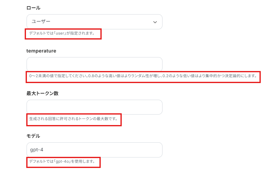 「ロール」「temperature」「最大トークン数」「モデル」は、入力欄下の説明に従って任意で設定してください。