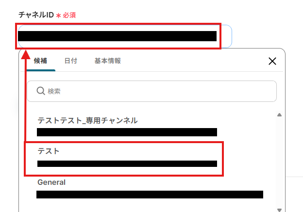 4.「チームID」と「チャネルID」は入力欄をクリックして表示される候補から選択してください。