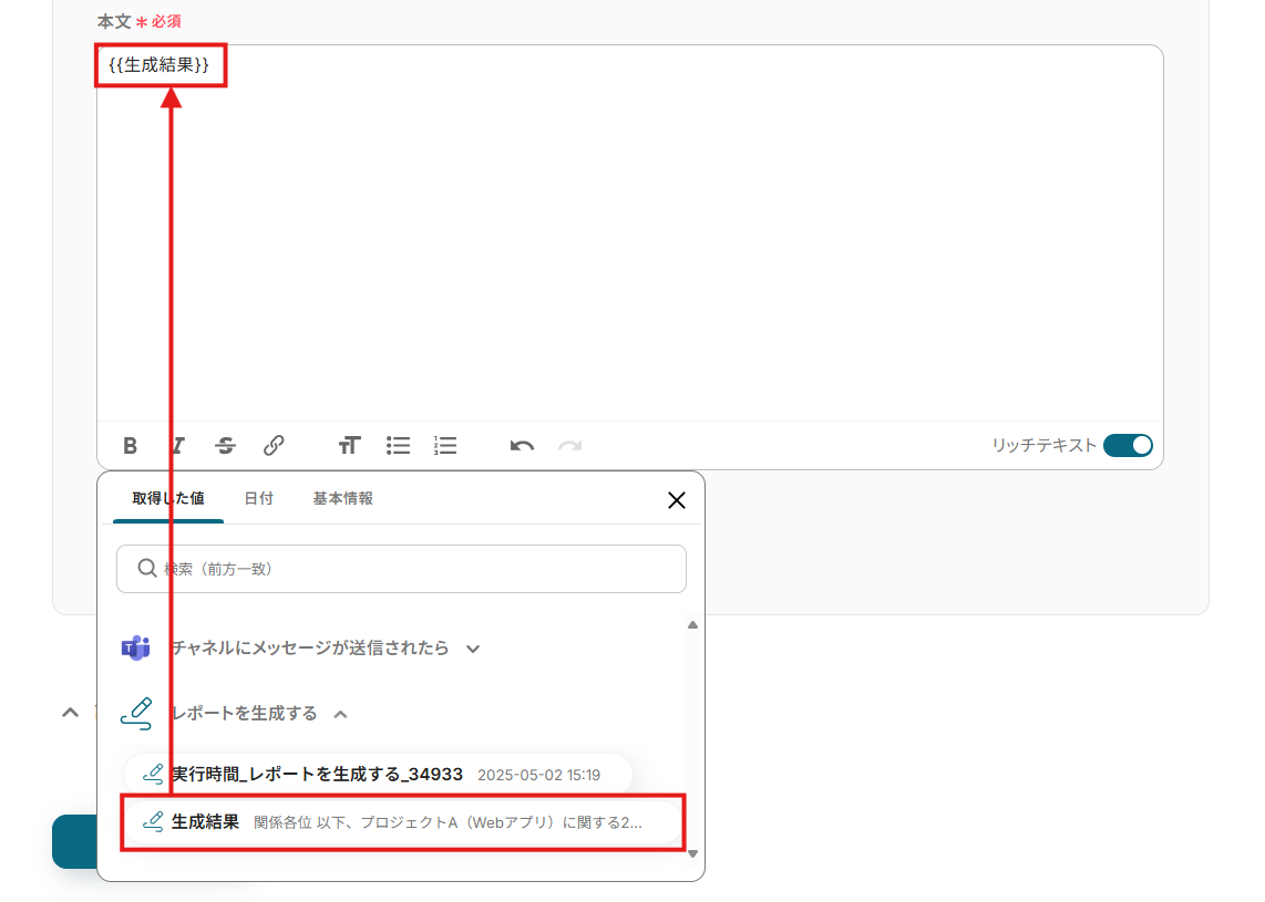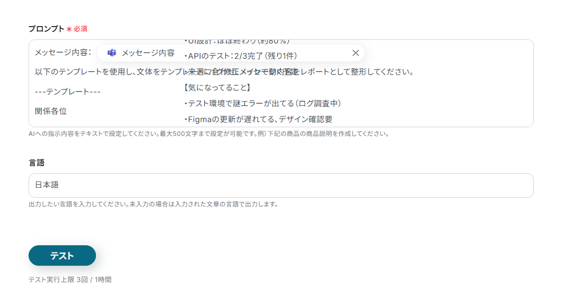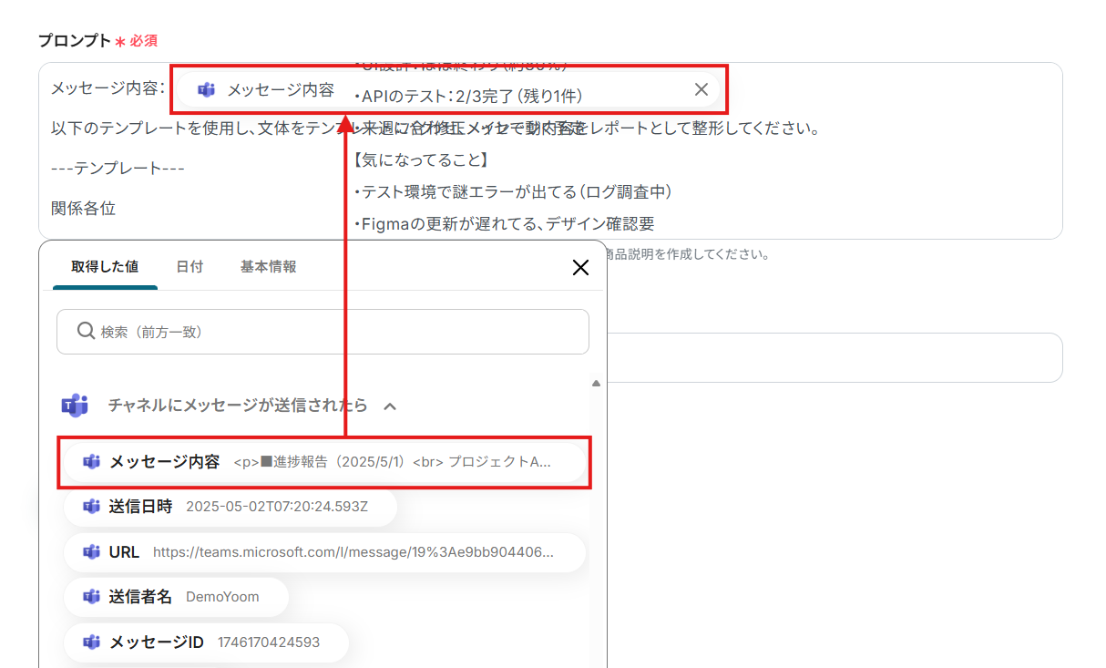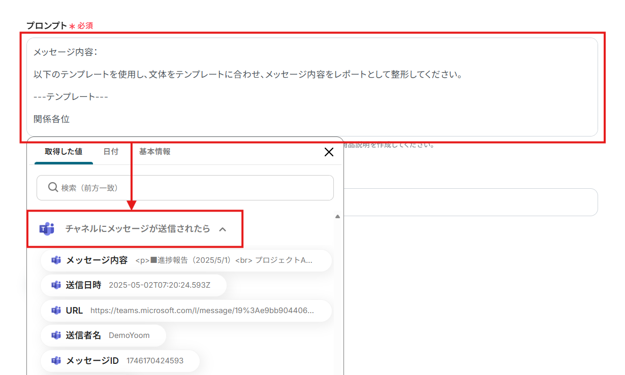 レポート生成に用いるデータと指示を「プロンプト」に設定。 入力欄クリック時に表示される「取得した値」タブから、トリガーアクションのメニューを開き、「メッセージ内容」を選択してください。 ※ タイトルを変更している場合は、変更後のタイトルが表示されます。 項目をクリックすると、入力欄に{{項目名 取得した値}}という形で追加されます。