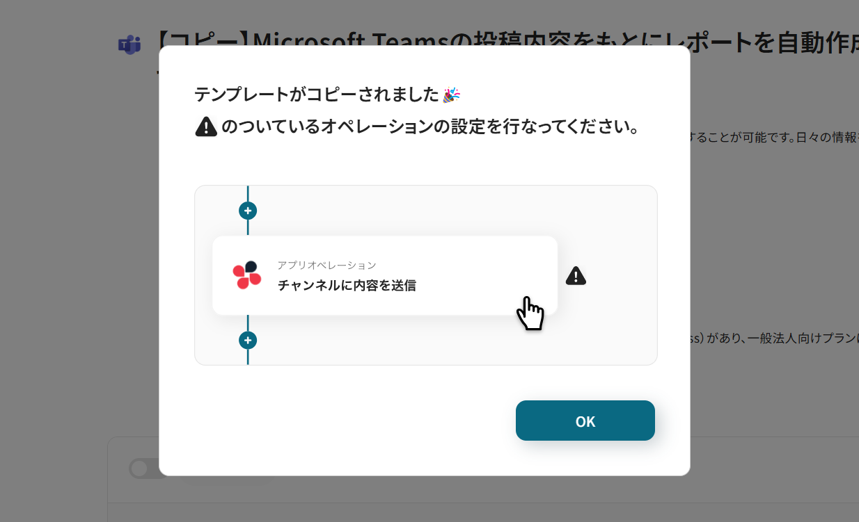 Yoomのワークスペースにテンプレートがコピーされ、自動化フローの設定画面(フローボット)が開きます。 「OK」をクリックして、フローの設定に進みましょう。