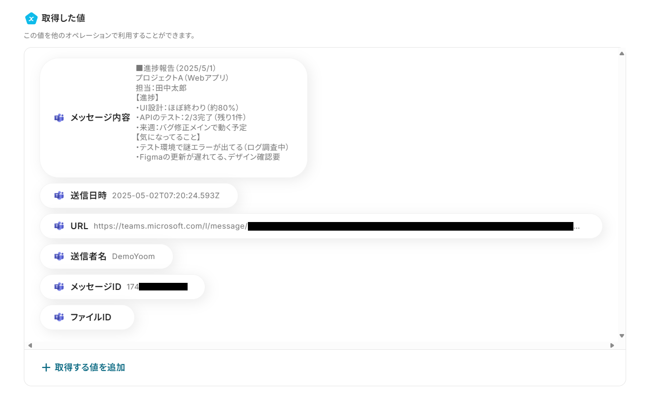 テストに成功すると、「取得した値」に投稿されたメッセージの情報が追加されます。