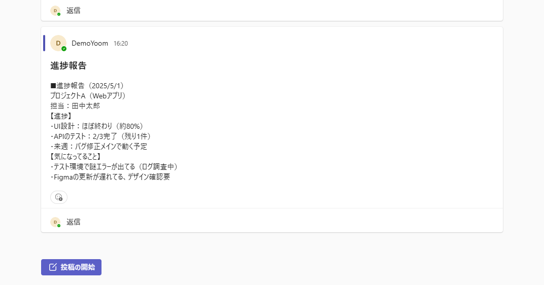 設定を終えたら、Microsoft Teamsの指定したチャネルに、レポートに用いるメッセージを投稿してください。 ※ 投稿するメッセージの例