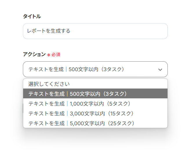 目的に応じた「アクション」をプルダウンから選択。 生成するテキストの文字数によってタスク数が変わります。