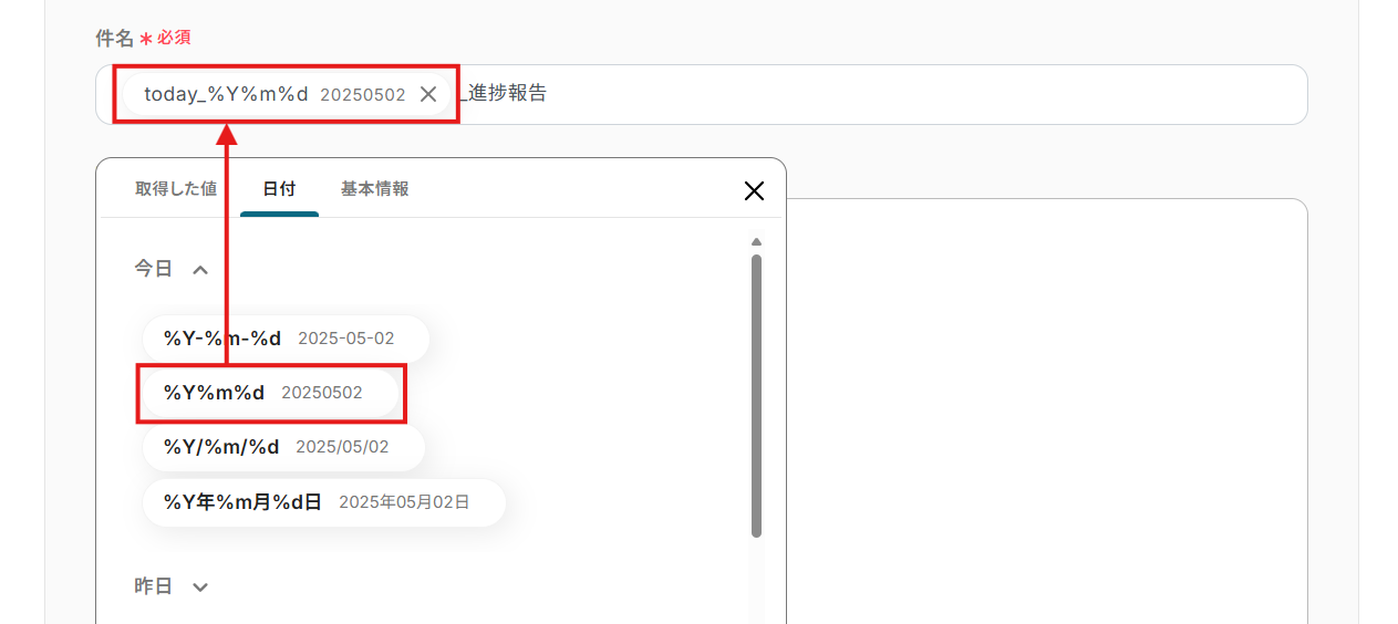 「取得した値」や「日付」を用いて、メッセージの内容に沿った「件名」と「本文」を設定。 ステップ4のプロンプト設定と同じように、入力欄クリック時に表示される項目から、使用したい項目を選択してください。