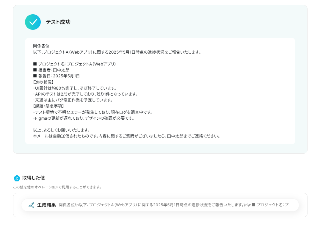 テストに成功すると、メッセージ内容から生成したレポートが「取得した値」に追加されます。