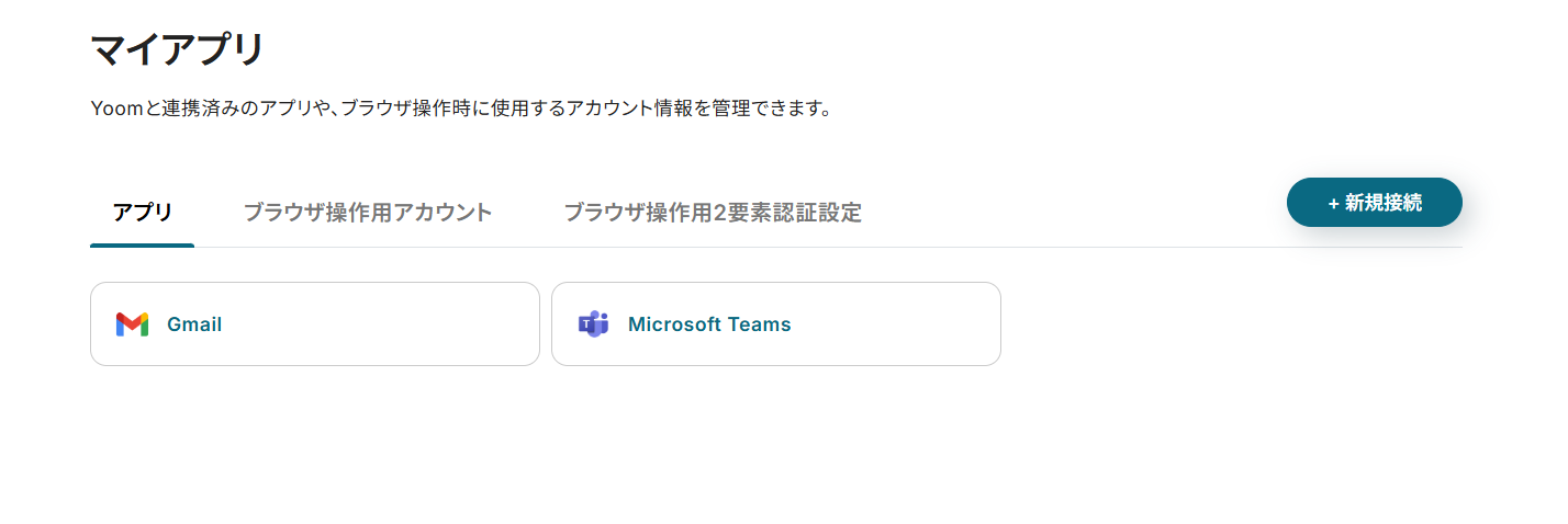 先ずは、Yoomと連携させたいMicrosoft TeamsアカウントとGmailアカウントを「マイアプリ」に登録しましょう。 この設定は初回のみ必要です。