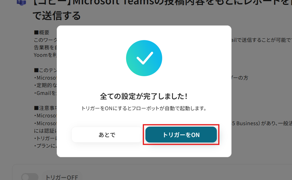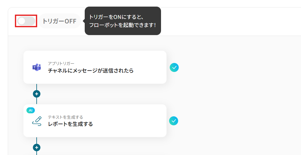 フロー画面に戻り、「全ての設定が完了しました!」と表示されていればフローの設定は完了です。 早速フローを稼働させるのであれば、「トリガーをON」をクリックします。