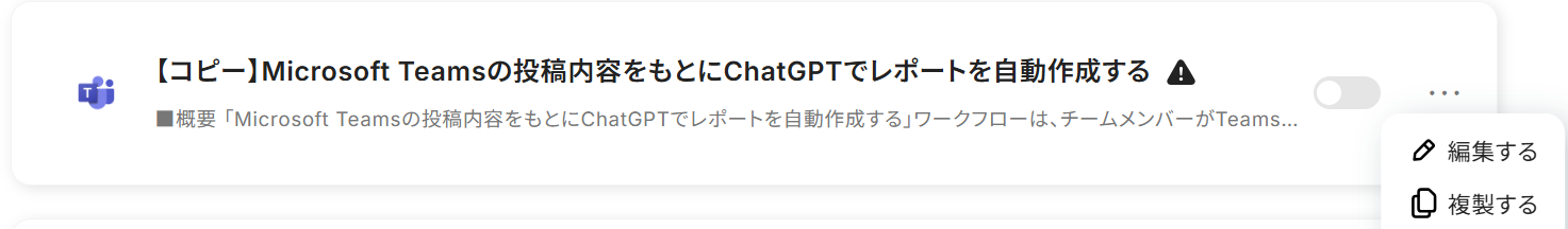 以下の画像が表示されたら、トリガーをONにしてください。 これですべての設定が完了したので、Microsoft Teamsの投稿内容をもとにChatGPTでレポートを自動作成されるかを確認してみましょう。