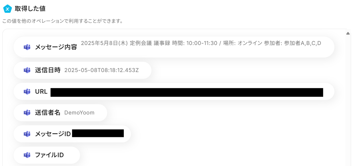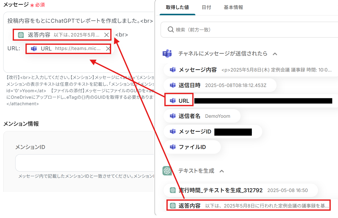 Microsoft Teamsの投稿から日付、発言者、メンションされたユーザーなどの特定の情報を抽出し、それらを整理した上でChatGPTに連携して構造化されたレポートを自動作成する フローです。