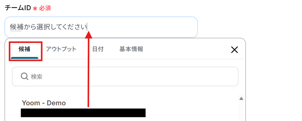 チームID・チャネルID :該当欄をクリックするとメニューが表示されます。赤枠の候補をクリックし、表示されたものからチャネルを選択してください。