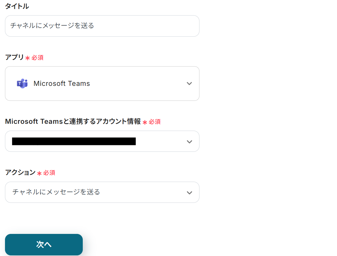 タイトルと連携するアカウント情報を任意で設定し、アクションはテンプレート通りのまま「次へ」をクリックして進んでください。