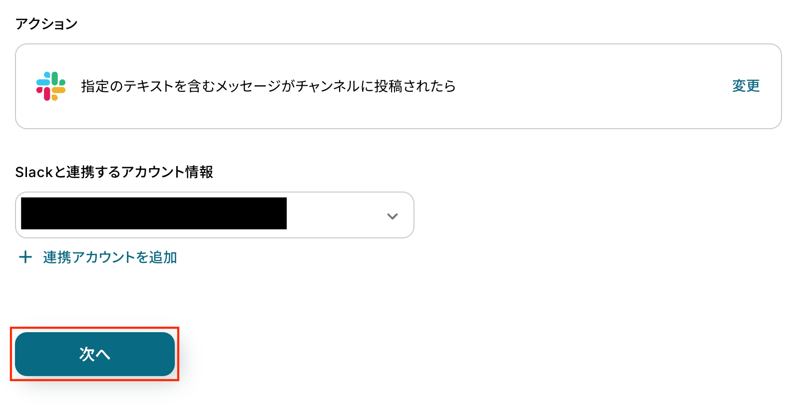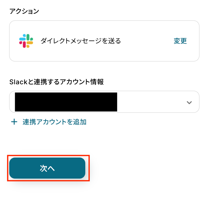 アクション内容を確認し、連携するSlackアカウントを選びます。