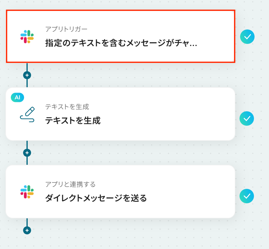 それではここから代表的な例として、Slackの特定チャンネルに投稿されたメッセージをトリガーとして、AIがテキストを生成し、担当者にDMで送信するフローの作成方法を解説します。このフローを使えば、問い合わせ対応の一次回答案作成や、報告内容の要約などを自動化できます!