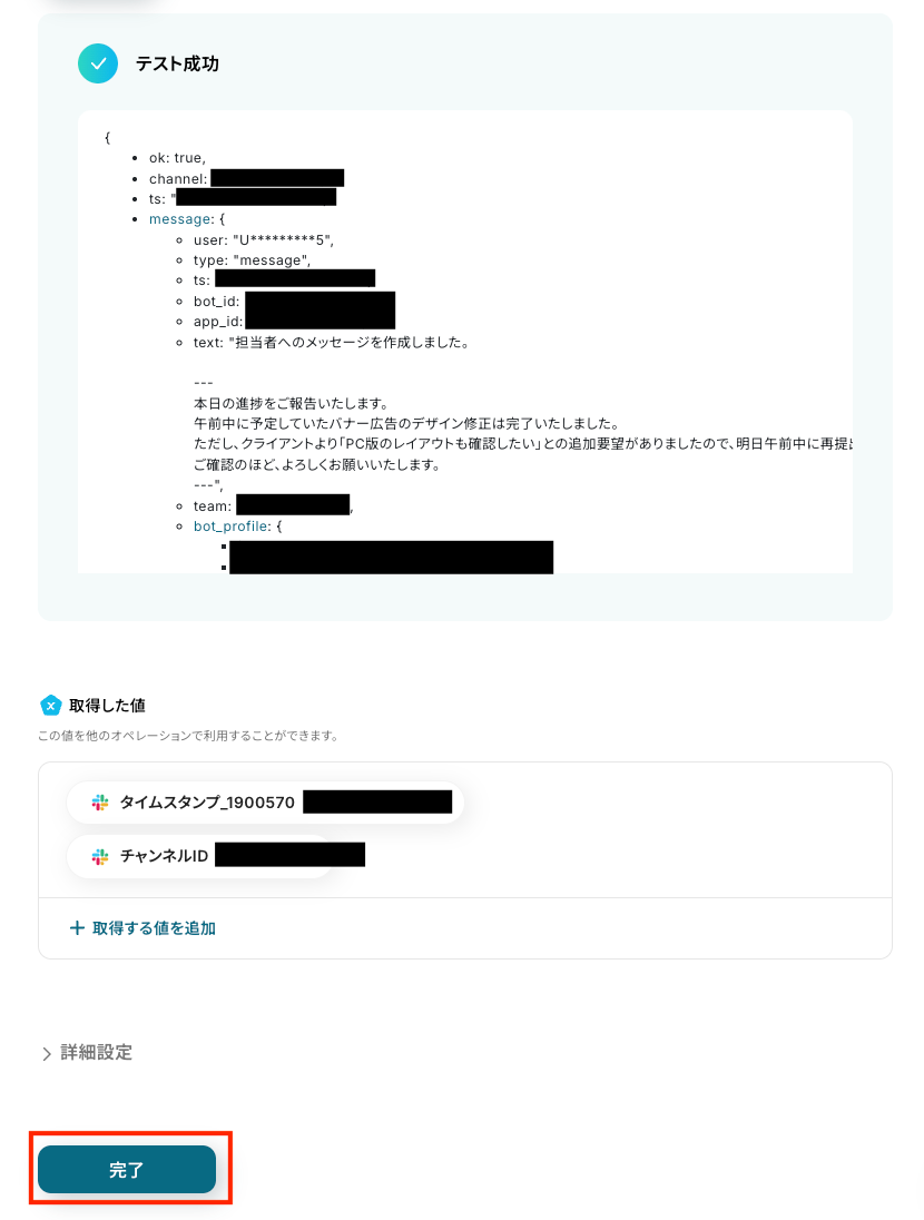- 最後に、Slackの「チャンネルにメッセージを送る」アクションを設定し、トリガーで取得した注文情報を指定のチャンネルに通知します。
