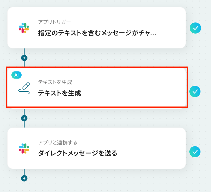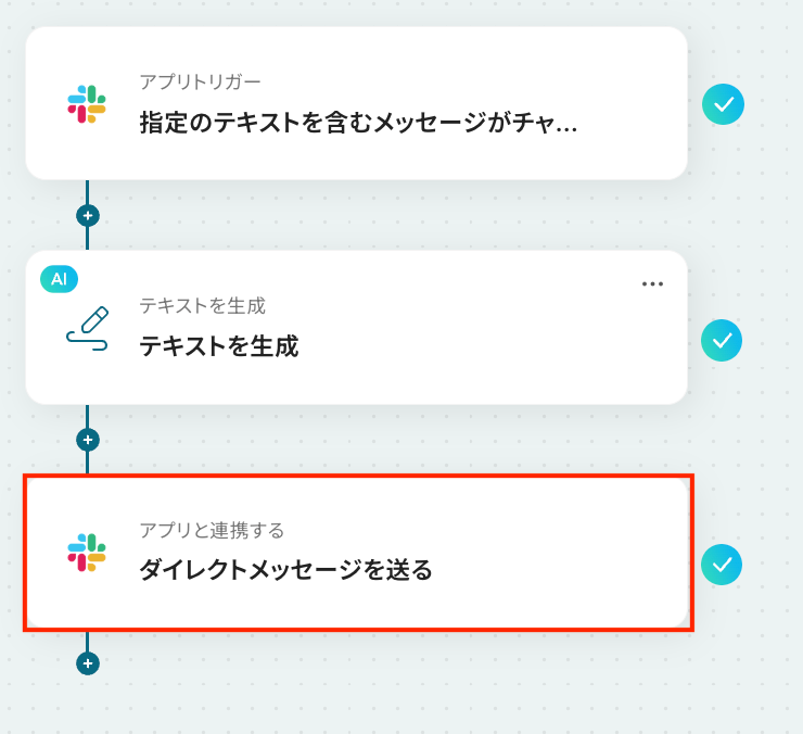- 最後に、オペレーションでSlackの「ダイレクトメッセージを送る」アクションを設定し、生成したテキストを指定の担当者へ送信します