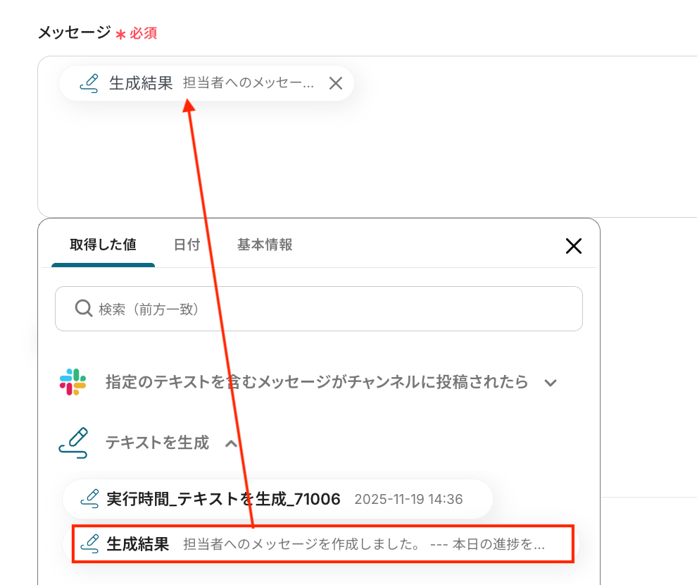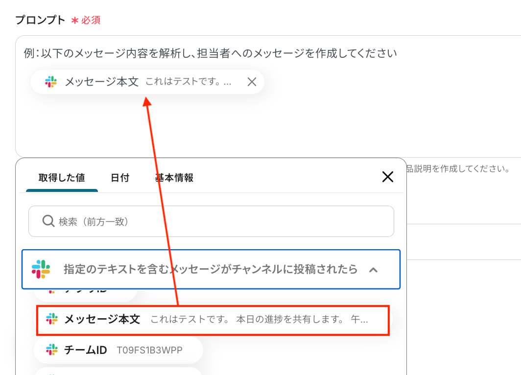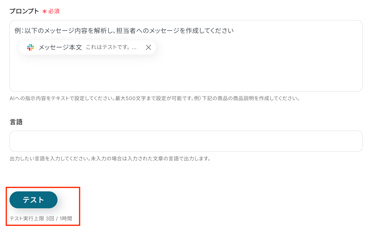 プロンプト入力欄に、Slackから取得した「メッセージ本文」を差し込みます。
