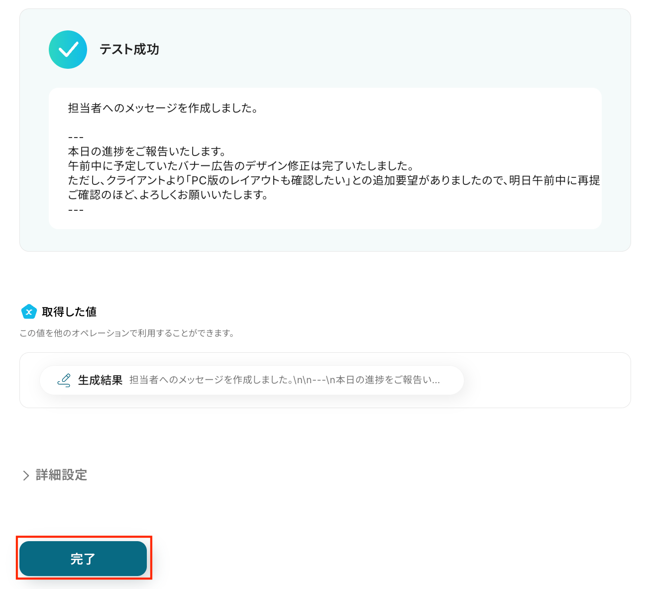 担当者に送るメッセージとして問題がなければ「完了」をクリックします。