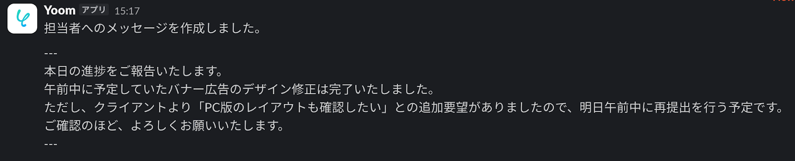 続いて、取得したSlackメッセージを基に担当者向けのメッセージを自動で作成します。