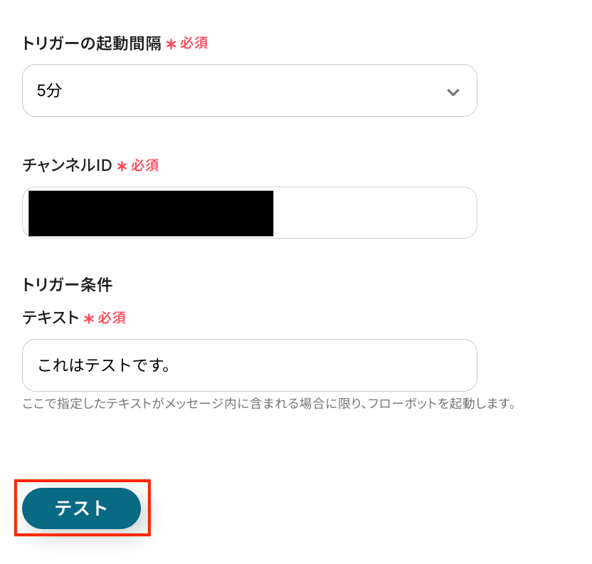 - Slackのトリガー設定では、ワークフローを起動させたい特定のチャンネルや、メッセージに含まれるキーワード(例:「完了」「クローズ」など)を任意で指定してください。