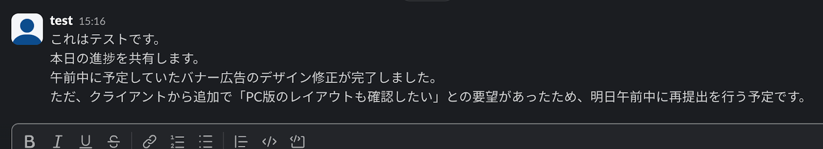 Slackで実際に「これはテストです。」という内容をテスト投稿しましょう。