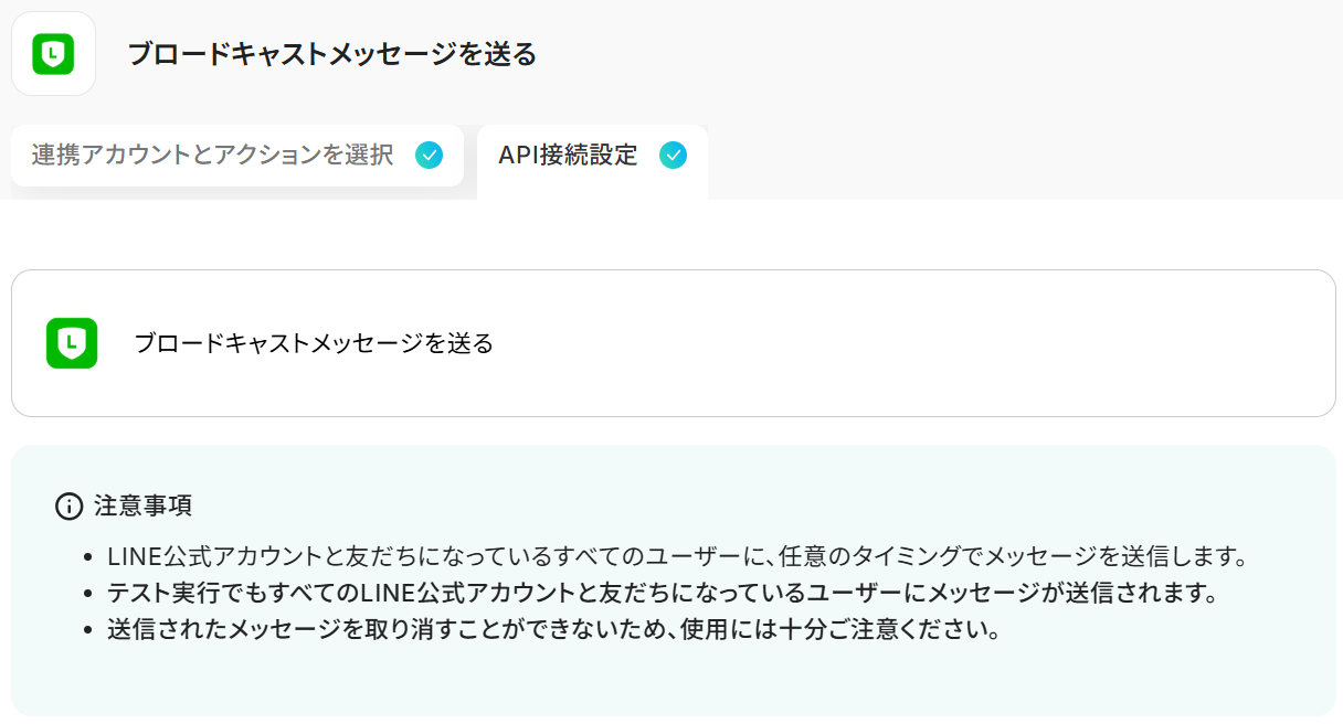 - 最後に、LINEを選択し、「ブロードキャストメッセージを送る」アクションを設定し、前のステップで取得したレコーディングURLを本文に含めて送信します。