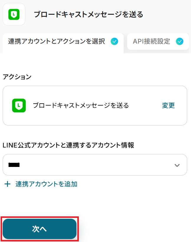 ステップ3と同様、アクションは「ブロードキャストメッセージを送る」のまま「次へ」をクリック。