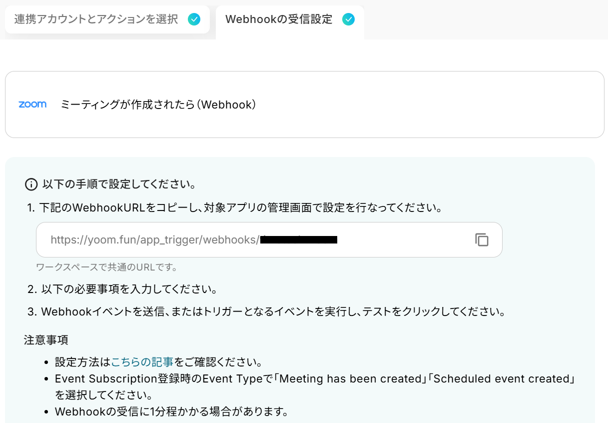 タイトルと連携するアカウント情報を任意で設定し、アクションはテンプレート通りに「ミーティングが作成されたら(Webhook)」のまま「次へ」をクリックします。