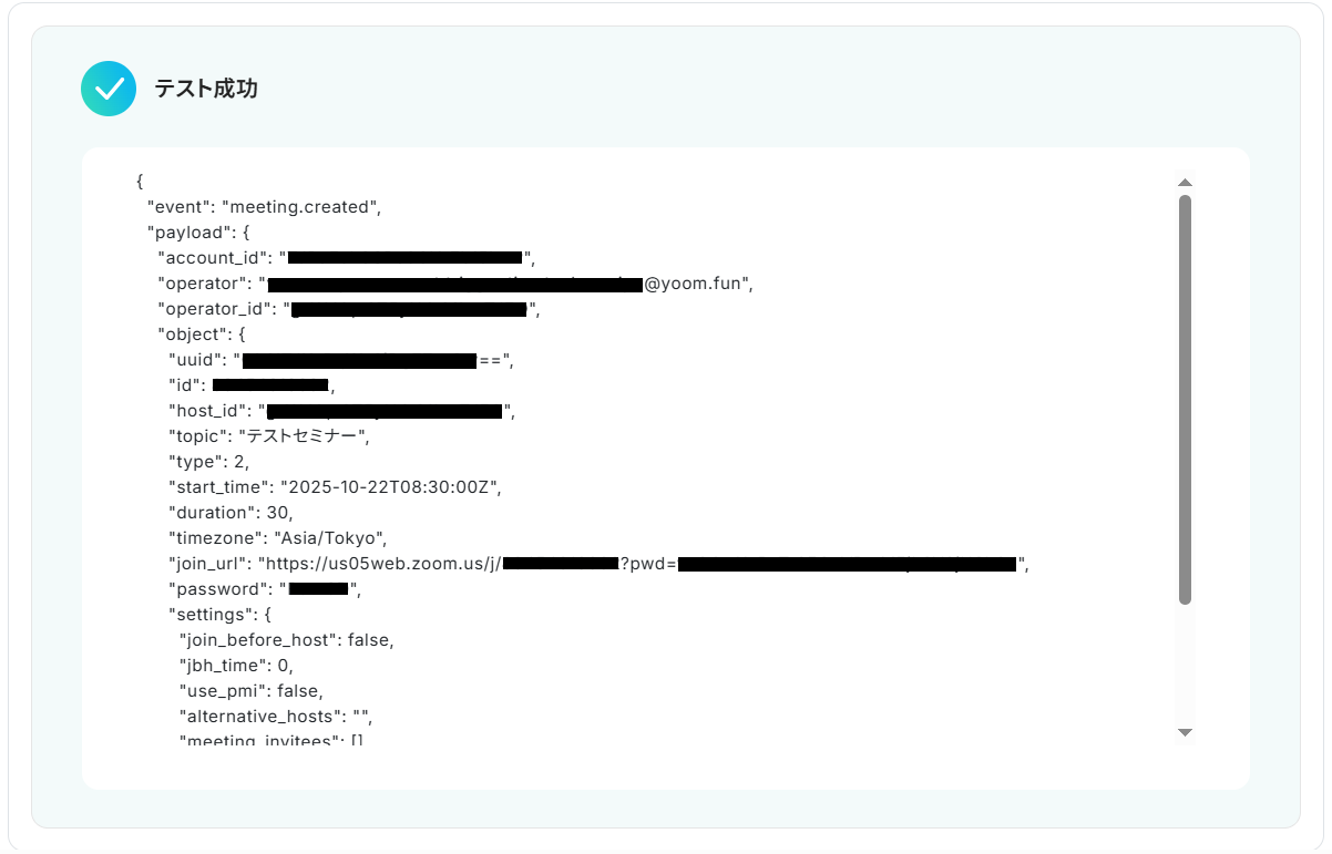 ここまで完了したらYoomの設定画面に戻りテストしてください。