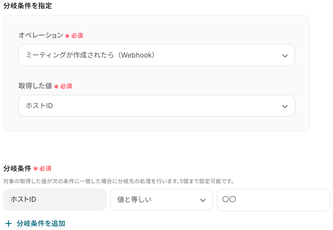 - Zoomのトリガー設定では、特定のホストIDを持つユーザーがミーティングを作成した場合のみフローを起動するように設定が可能です