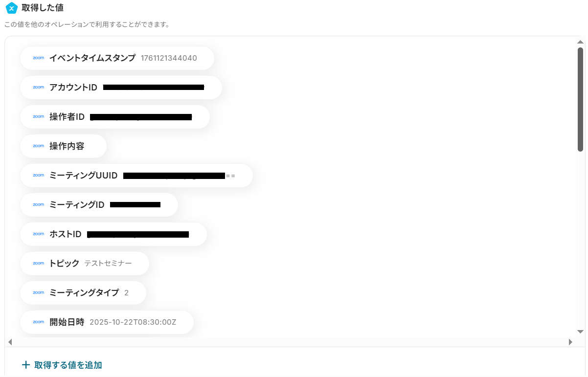 - 続いて、オペレーションでZoomの「ミーティングを作成」アクションを設定し、前のステップで取得した情報を元に会議を作成します