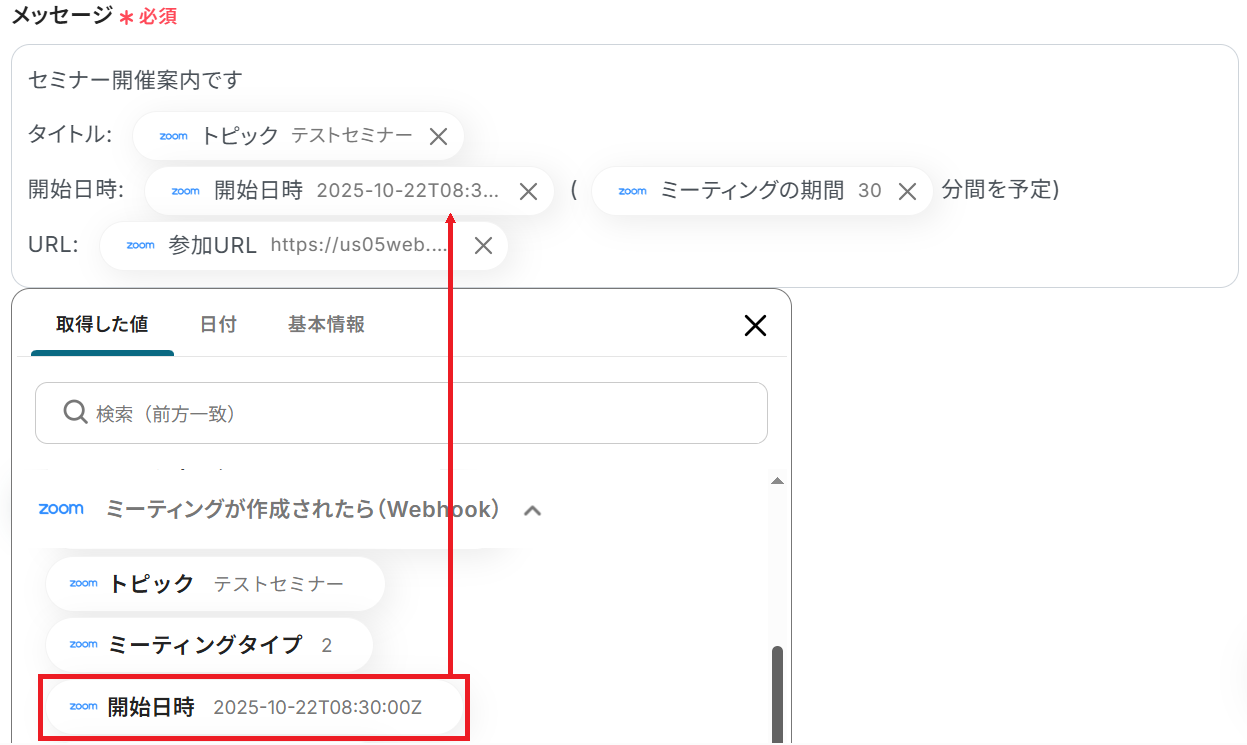 - Zoomのミーティング作成では、議題や説明欄に、前段のステップで抽出した情報を変数として埋め込むなど、設定内容を自由にカスタマイズできます。