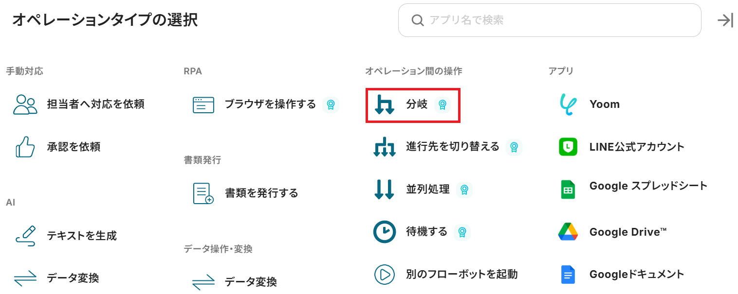 - 続いて、オペレーションの「分岐機能」を活用し、特定の条件に合致した場合のみ後続のアクションが実行されるよう設定します