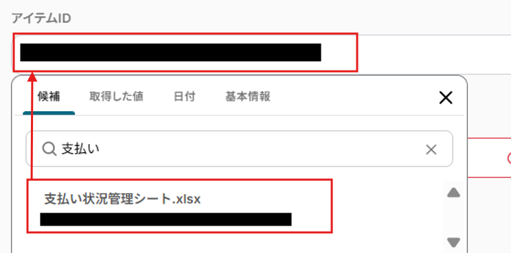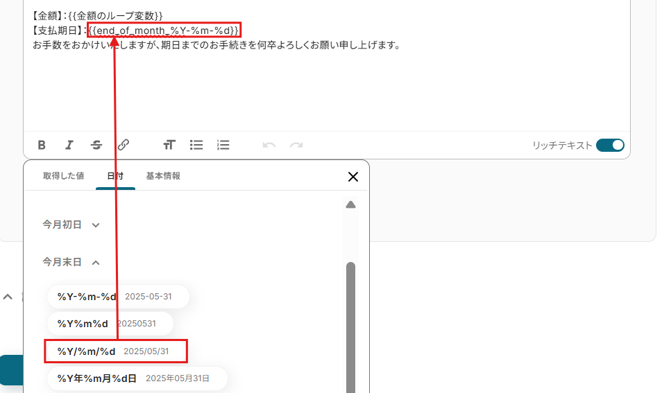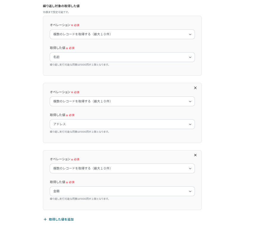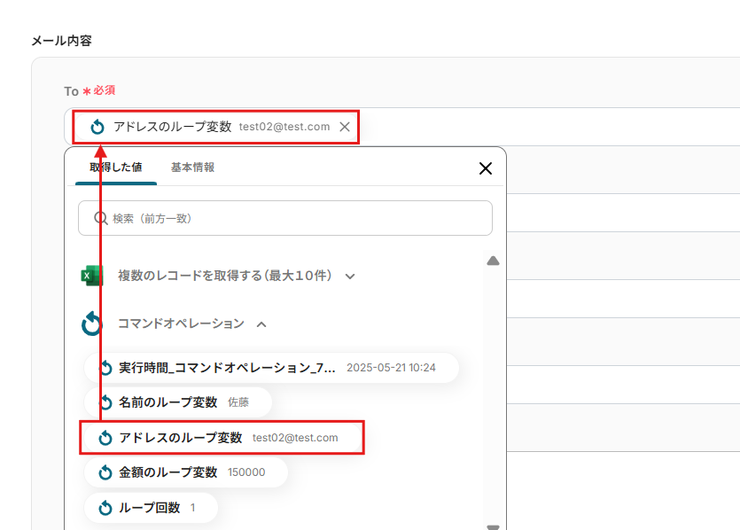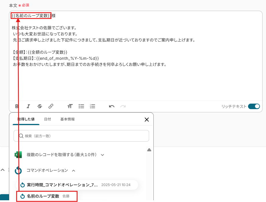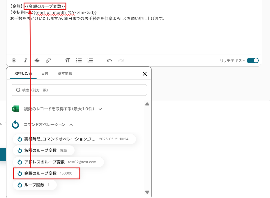 金額は、取得した値から「金額のループ変数」を選びましょう。