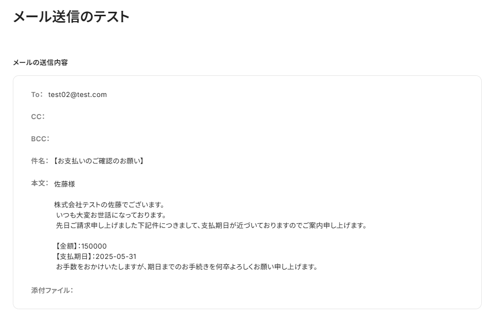 設定したメール内容を確認して、「テスト」をクリックしてください。