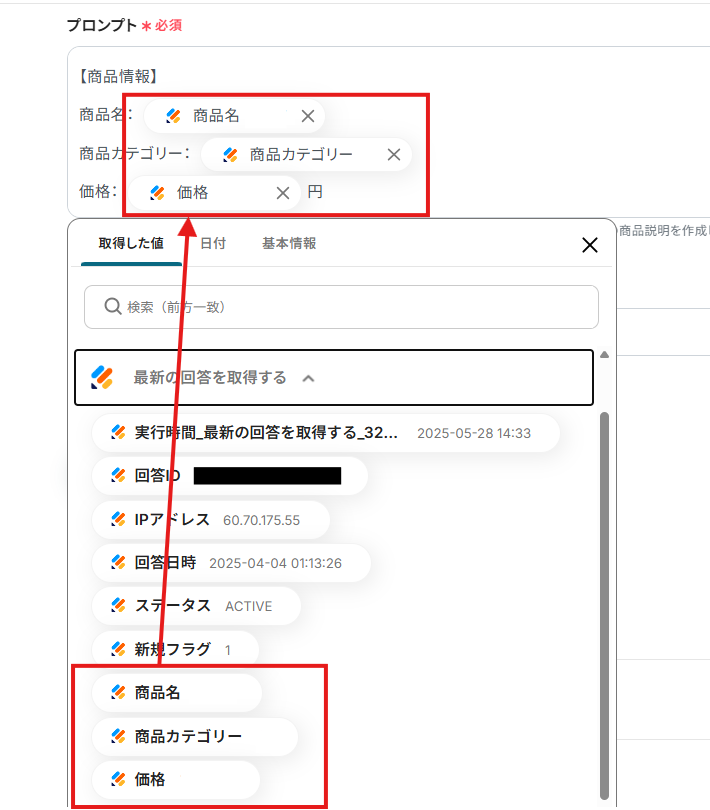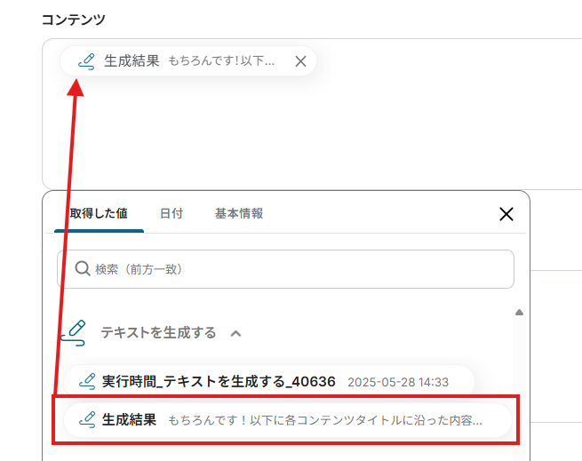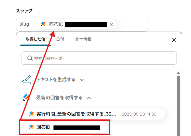 入力欄をクリックして表示されるアウトプット(取得した値)から選択してください。