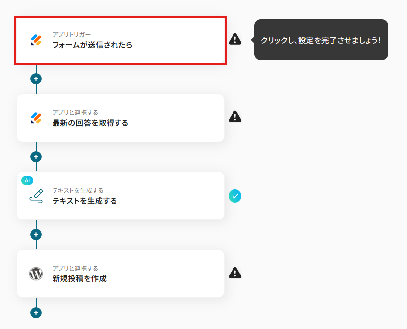 はじめに、JotformとWordPressをYoomと連携します。 次に、トリガーでJotformを選択し、「フォームが送信されたら」というアクションを設定します。 続いて、オペレーションでJotformの「最新の回答を取得する」アクションを設定し、送信されたフォームの内容を取得します。 次に、オペレーションでAI機能の「テキストを生成する」アクションを設定し、取得したJotformの回答内容を元に、投稿用のテキストを生成させます。 最後に、オペレーションでWordPressの「新規投稿を作成」アクションを設定し、AIが生成したテキストを本文などに入れて下書き保存します。 ※「トリガー」:フロー起動のきっかけとなるアクション、「オペレーション」:トリガー起動後、フロー内で処理を行うアクション
