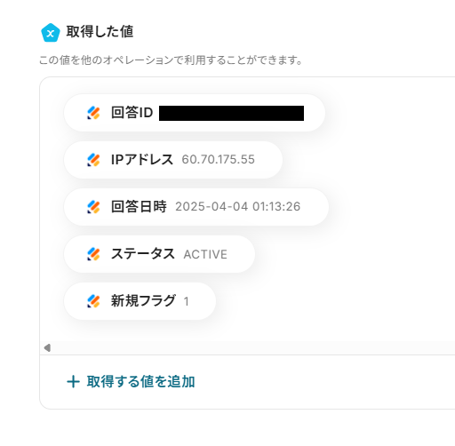 ※今回、後続の設定でアウトプット(取得した値)を使用するため、取得する値を追加しています。 詳しい追加方法は、こちら をご参照ください。