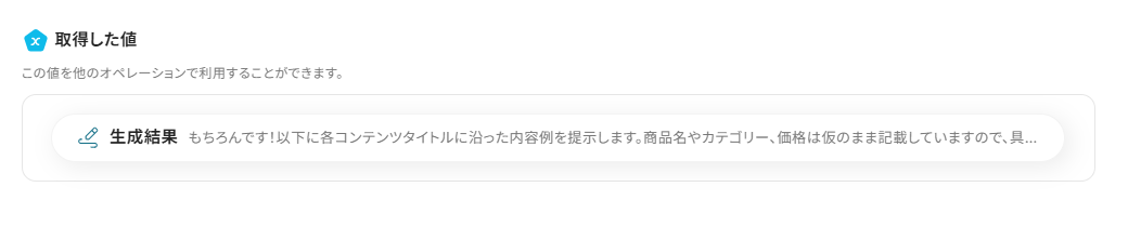 ※アウトプットとは? アウトプットとは、トリガーやオペレーション設定時に、「テスト」を実行して取得した値のことを指します。 取得したアウトプットは、後続のオペレーション設定時の値としてご利用いただくことができ、フローボットを起動する度に、変動した値となります。 ※詳しくは、こちら をご参照ください。