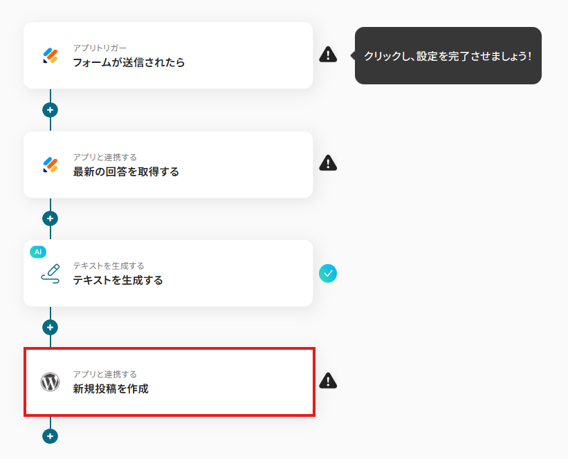 AI機能のアクションでは、Jotformから取得したどの情報を元にテキストを生成させるかなど、プロンプトを任意でカスタムすることが可能です。 WordPressのアクションでは、投稿のタイトルや本文、カテゴリーなどを任意で設定でき、前段で取得した値を埋め込むなどのカスタムが可能です。 ■注意事項