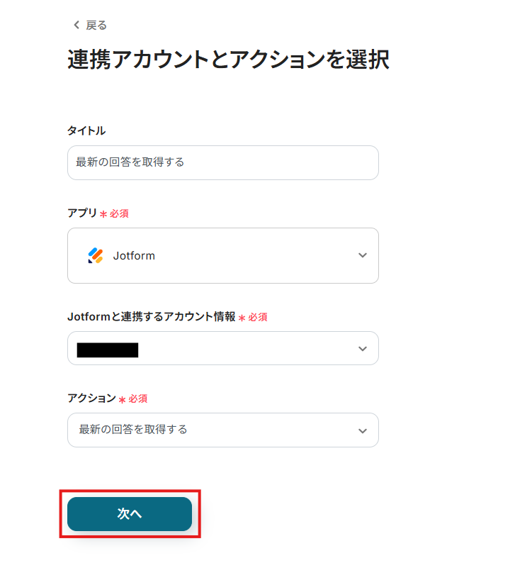 2.連携アカウントとアカウント選択画面が表示されるので、設定内容を確認しましょう。 連携するアカウント情報には、ステップ1で連携したアカウント情報が反映されています。 トリガーアクションはそのままにして、「次へ」をクリックしてください。