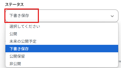 「ステータス」は、投稿の状態を選択します。プルダウンから下書き保存 を選択しましょう。