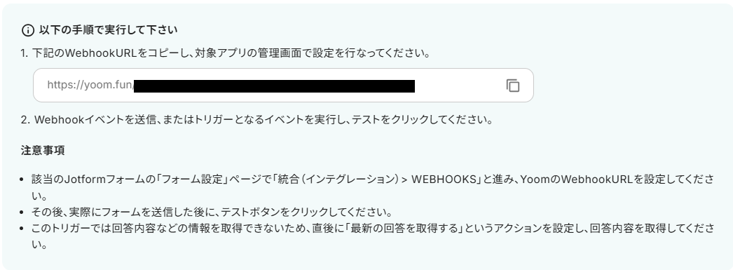 3.表示された画面で、以下画像の手順・注意事項に沿ってWebhookの設定をしていきます。